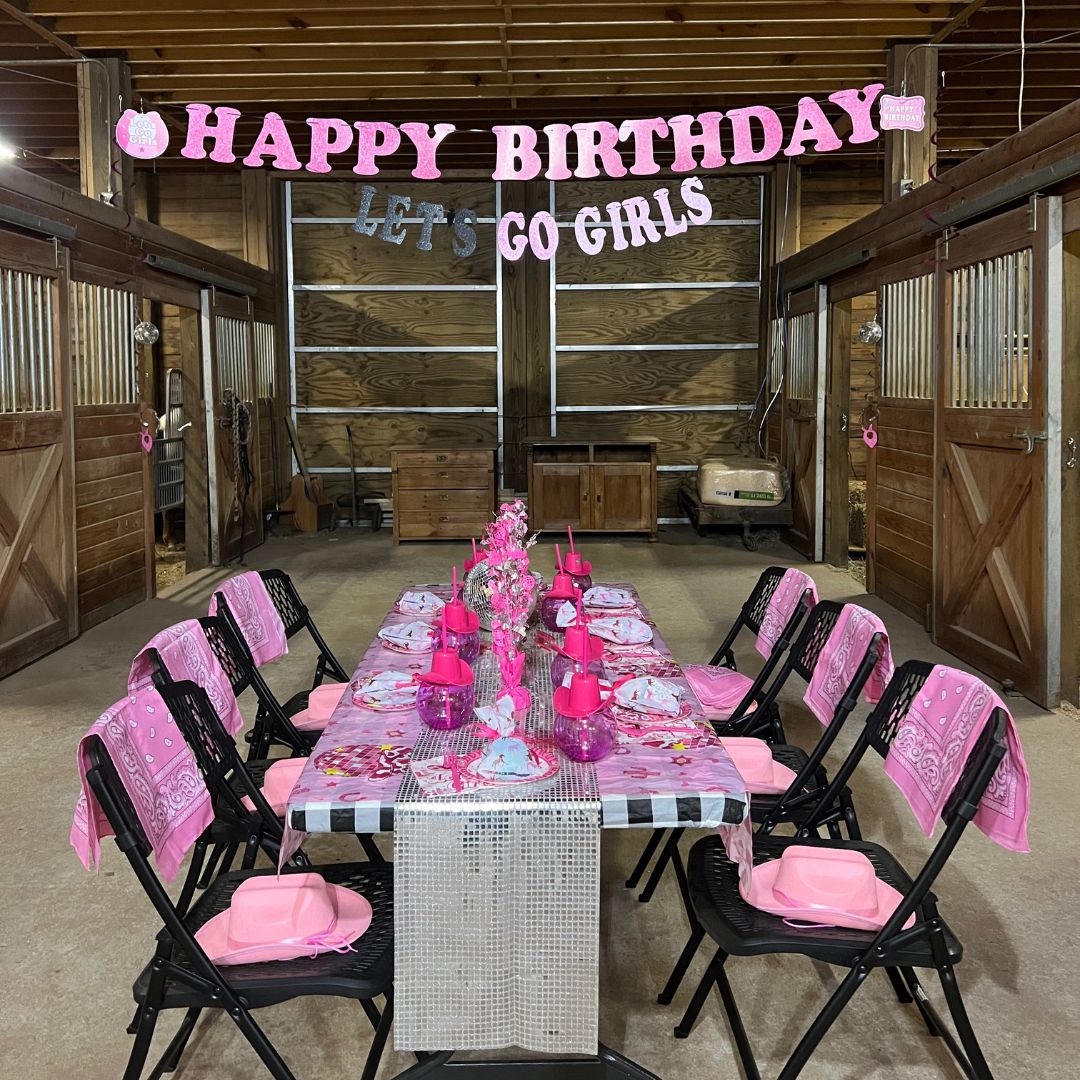 Looking for a unique and unforgettable birthday party experience? Our private barn in Cumming, GA, offers the perfect setting for farm and horseback riding birthday celebrations. Set against the backdrop of a classic red barn, your guests will enjoy interacting with our friendly horses, ponies, baby foals, pigs, and dogs. Whether you’re looking to drop off your decorations for us to set up or prefer a full-service package where we take care of everything—from buying to decorating—you can relax and enjoy the day stress-free.